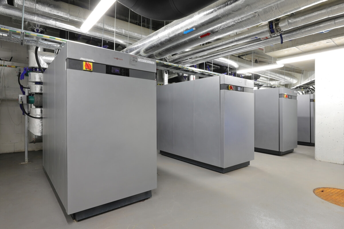 Hybrydowy system grzewczo-chłodniczy oparto na pompie ciepła woda–woda, zasilanej wodą wodociągową pochodzącą z budynku filtrów. Ciepło odbierane jest poprzez wymienniki płytowe, co pozwala na separację układów i bezpieczną, efektywną wymianę energii.